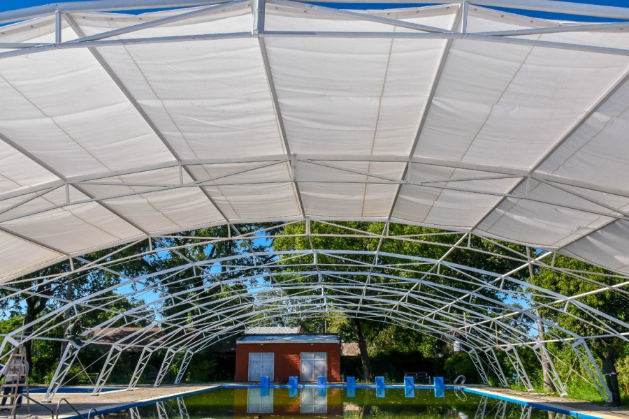 La cubierta se colocará sobre la estructura domo que ya se había realizado para la temporada de verano, la misma es de lona reforzada y con costuras de transparencias en las puertas laterales para que tenga visibilidad el interior, además es desmontable por completo o por partes ya que no se la pondrá en verano.