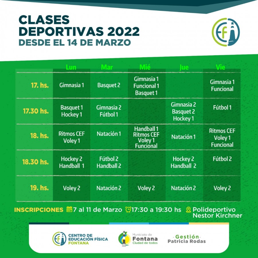 Lunes: Gimnasia a las 17 horas, Básquet y Hockey a las 17.30 horas, Ritmos y Voley a las 18 horas, Hockey y Handball a las 18:30 horas y Voley a las 19 horas. Martes: Básquet 2 a las 17 horas, Gimnasia y Fútbol a las 17:30 horas, Natación a las 18 horas, Fútbol y Handball a las 18:30 horas y Natación a las 19 horas. Miércoles: Gimnasia, Funcional y Básquet a las 17 horas, Handball, Ritmos, Voley y Funcional a las 18 horas y Voley a las 19 horas. Jueves: Gimnasia, Básquet y Hockey a las 17:30 horas, Natación a las 18 horas, Hockey y Handball a las 18.30 horas y Natación a las 19 horas. Viernes: Gimnasia y Funcional a las 17 horas, Fútbol a las 17:30 horas, Ritmos, Voley y Funcional a las 18 horas, Fútbol a las 18.30 horas y Voley a las 19 horas.