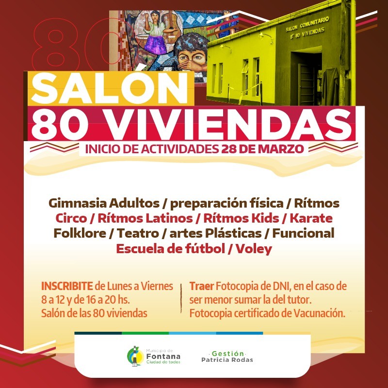 El Salón Comunitario del Barrio 80 Viviendas de la ciudad de Fontana retomó sus actividades ésta semana. El salón comenzó a funcionar nuevamente hace menos de un año luego de estar sin funcionamiento por varios años debido a sus condiciones edilicias.